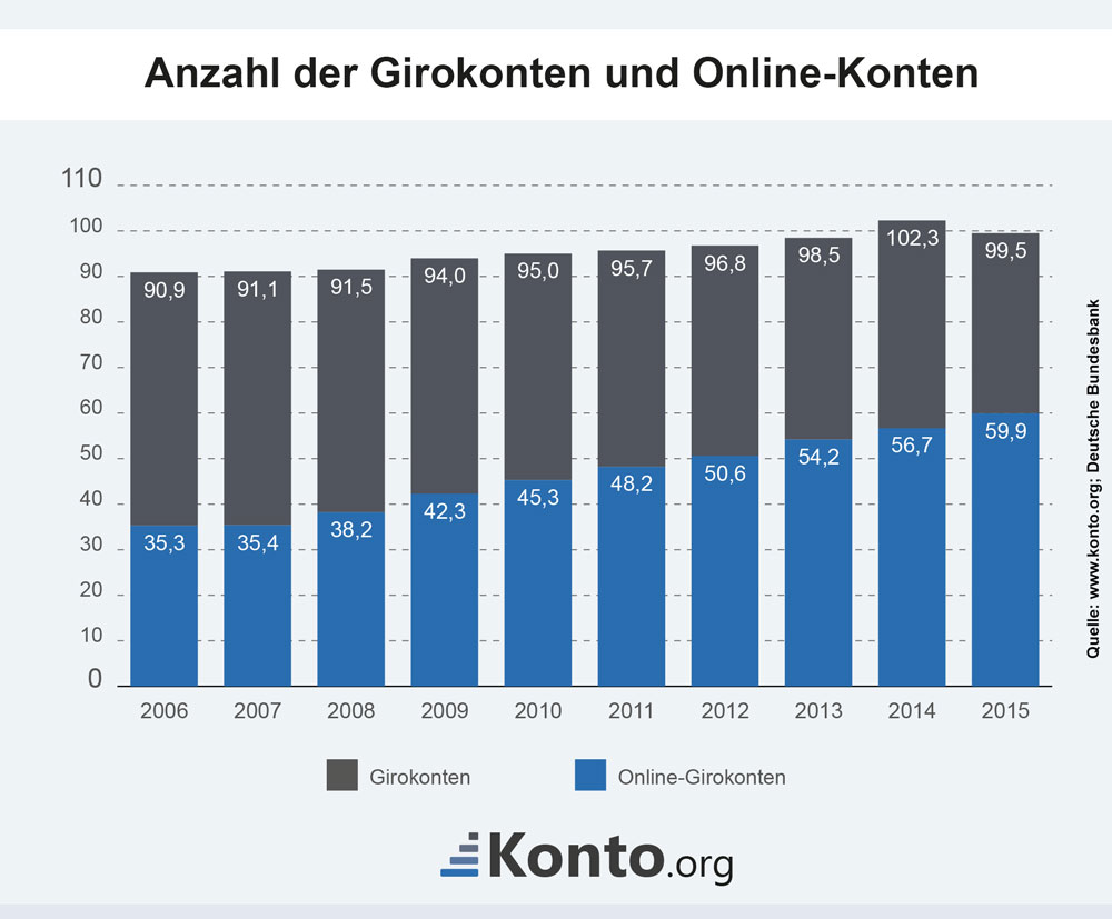 Die Infografik zeigt die Anzahl der in Deutschland geführten Girokonten und Onlinegirokonten.