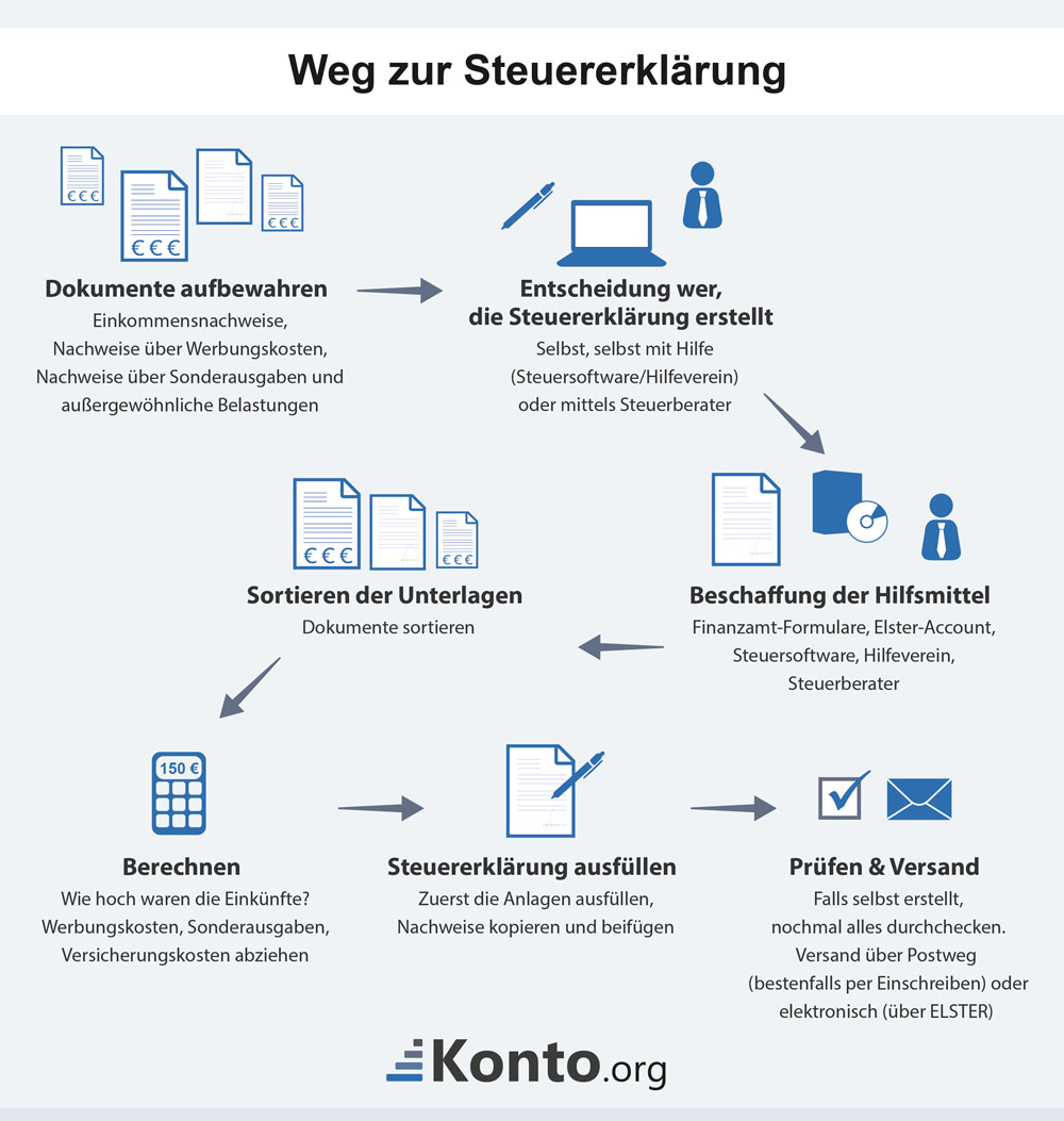 Die Grafik zeigt Schritt für Schritt, wie man bei der Erstellung einer Steuererklärung vorgehen sollte.